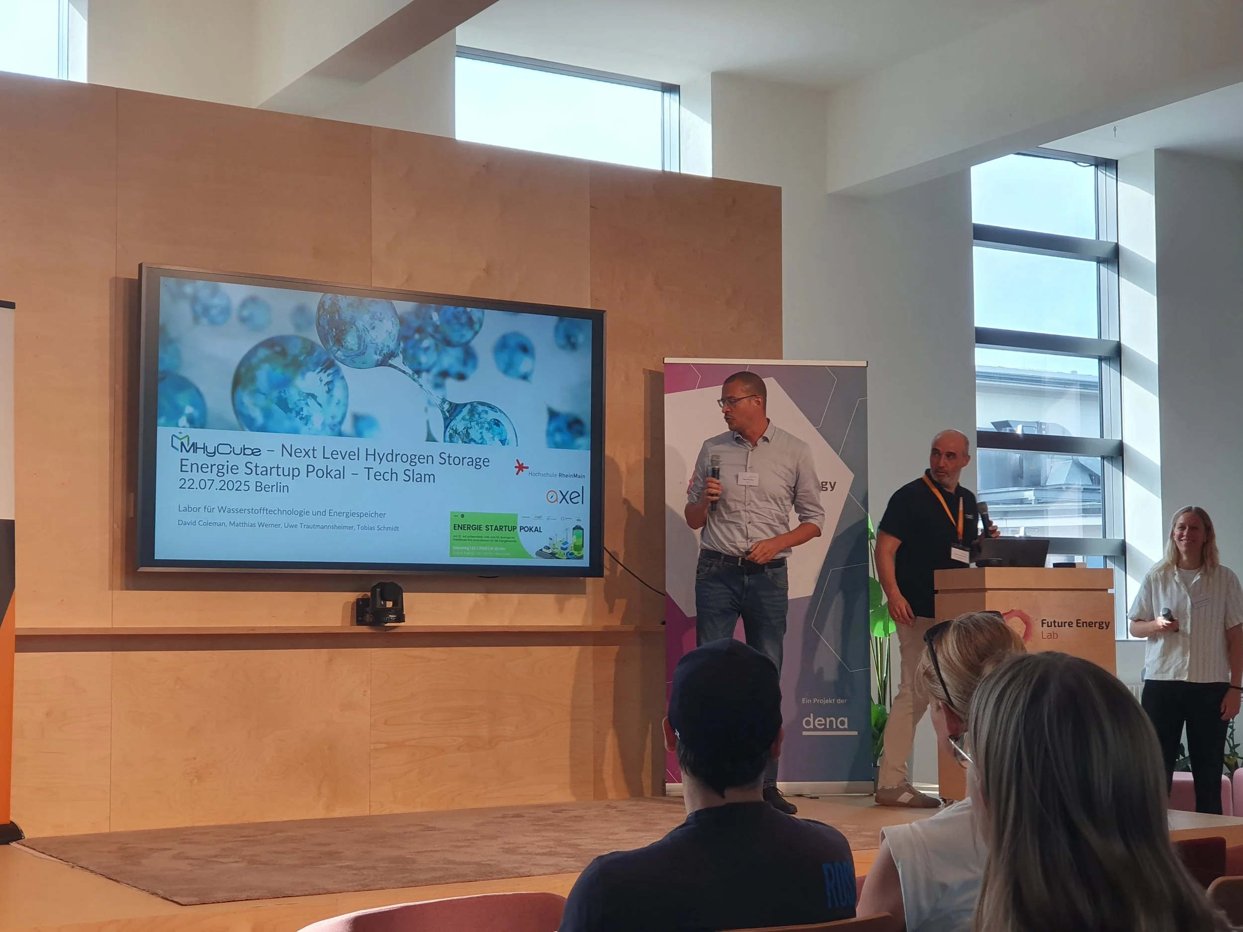 Besonders gefreut haben wir uns über das große Interesse an unserer Lösung für einen Metallhydrid-Niederdruckspeicher für stationäre Wasserstoffanwendungen. Im Anschluss an unsere Präsentation konnten wir viele spannende Gespräche mit Expert:innen, Investor:innen und anderen StartUps führen – ein wertvoller Austausch, der uns inspiriert und motiviert hat.